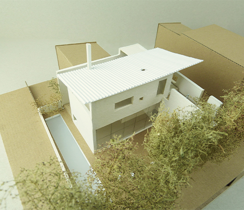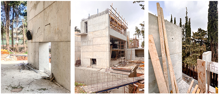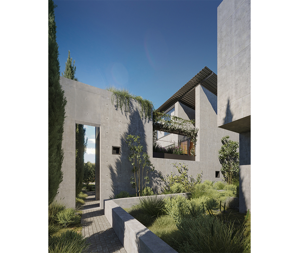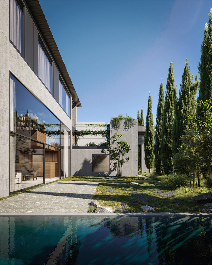 The house is developed in a square site with centennial cypresses situated in the northern Athenian suburbs. The trees, lined up facing north, create a linear pathway which connects the main road with the house’s entrance. The aim of the architectural design was to integrate this green “soft wall” into the house by making it the central point of the plan arrangement.