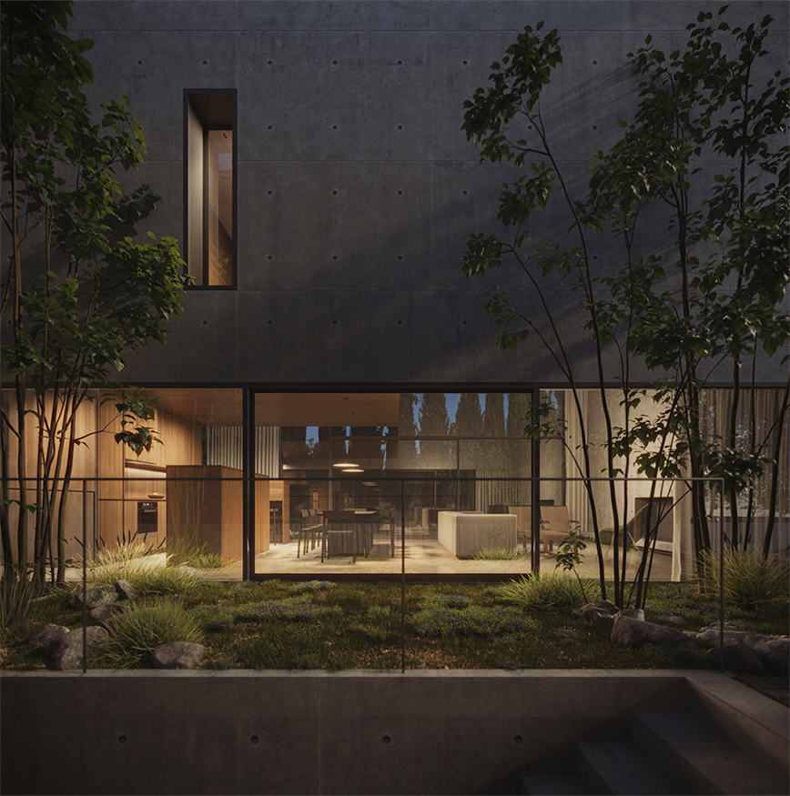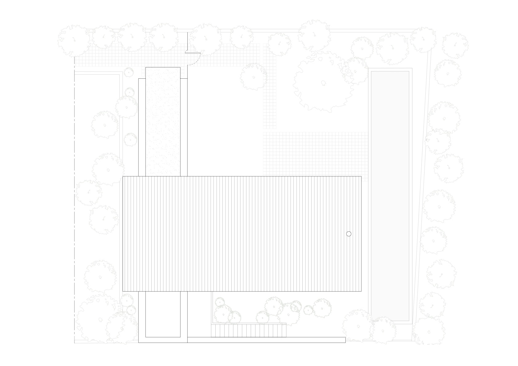 A large scale opening in the northen facade looks at the main garden, the swimming pool and the trees. On the southern side, there’s a smaller, more introvert garden, which can be approached through a wide, linear window. This secondary garden is enclosed by the building’s main volume and a plain concrete wall that, in a way, completes the feeling that the whole house is surrounded by trees and greenery. The interior living space becomes transparent and allows a seamless indoor and outdoor transition.